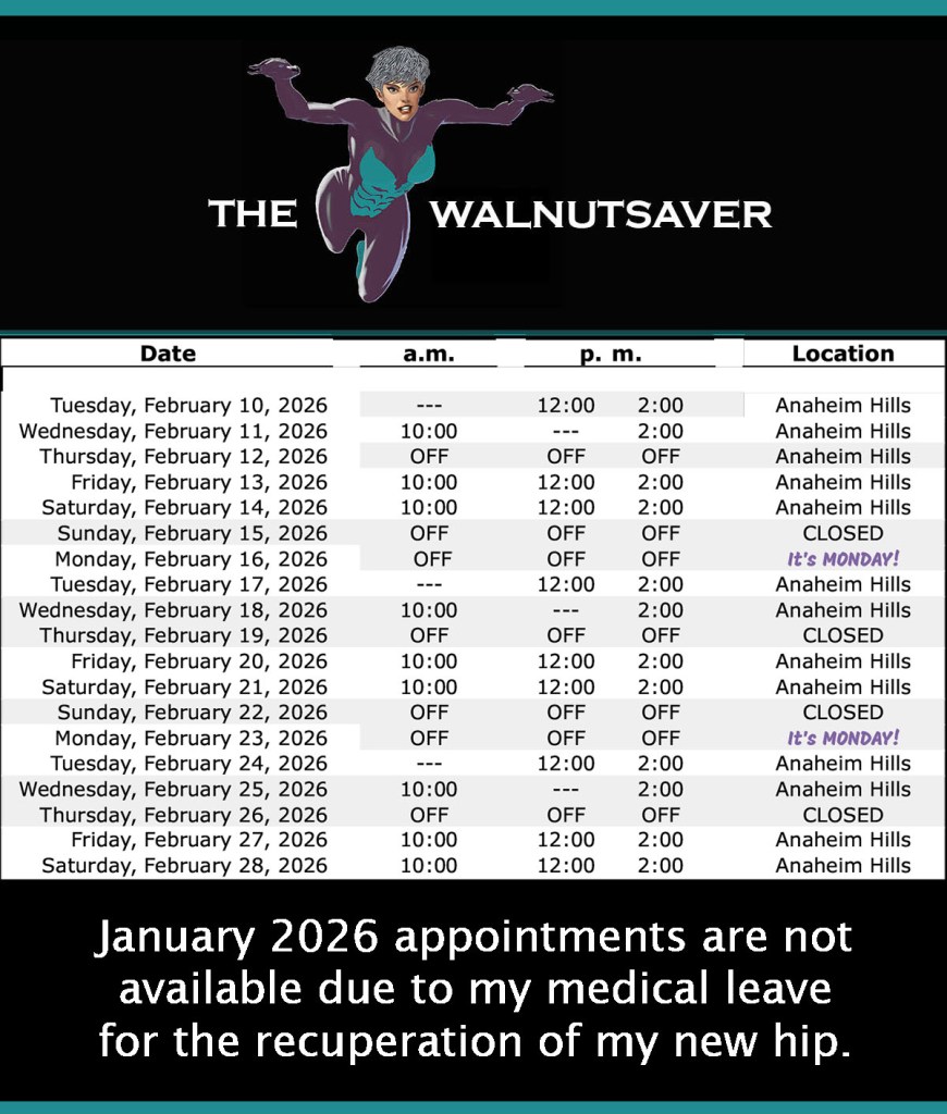 Here’s the scheduling guide for the next two weeks. Appointments are at 10:00 a.m., noon and 2:00 p.m. on Tuesday, Wednesday, Friday and Saturday. Times showing are available. Lines indicate appointments that are already taken. Please email me @ walnutsaver@gmail.com your date & time choices even if it is not yet shown below and I will confirm with address info. |